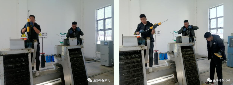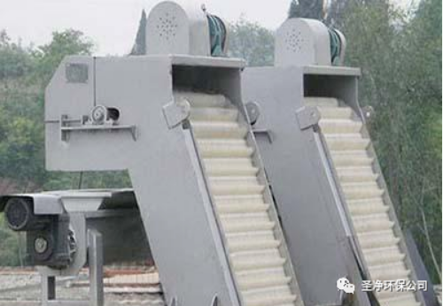 耙齒鏈運轉(zhuǎn)到設備的上部時,由于槽輪和彎軌的導向,使每組耙齒之間產(chǎn)生相對自清運動,絕大部分固體物質(zhì)靠重力落下。另一部分則依靠清掃器的反向運動把粘在耙齒上的雜物清掃干凈。